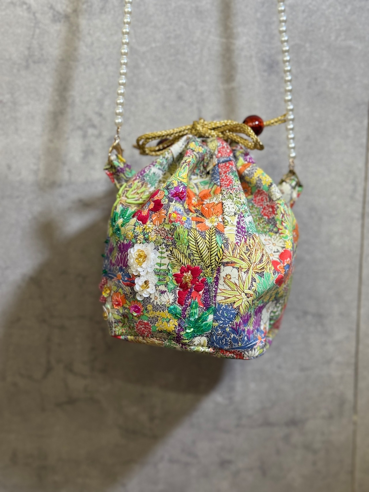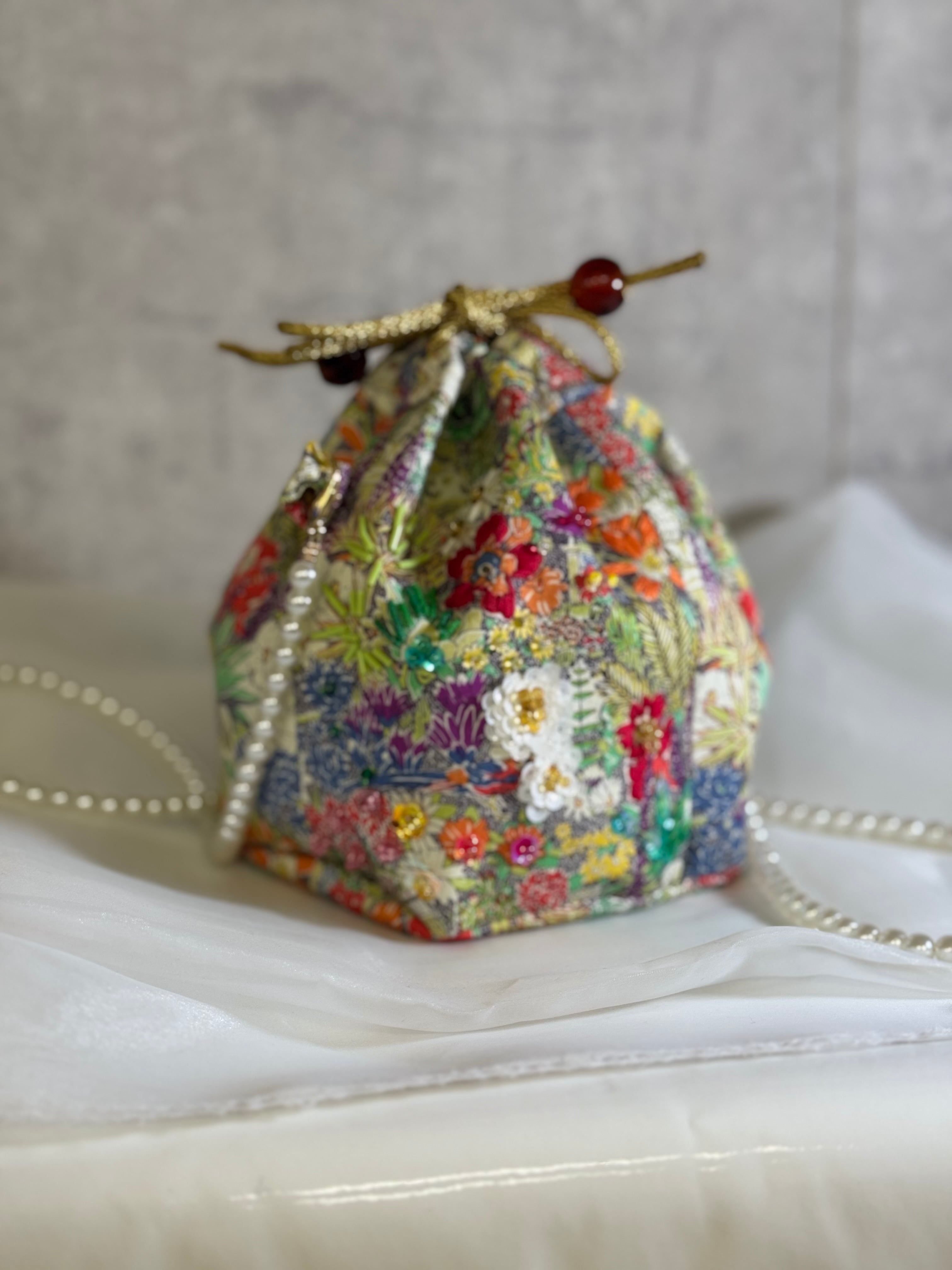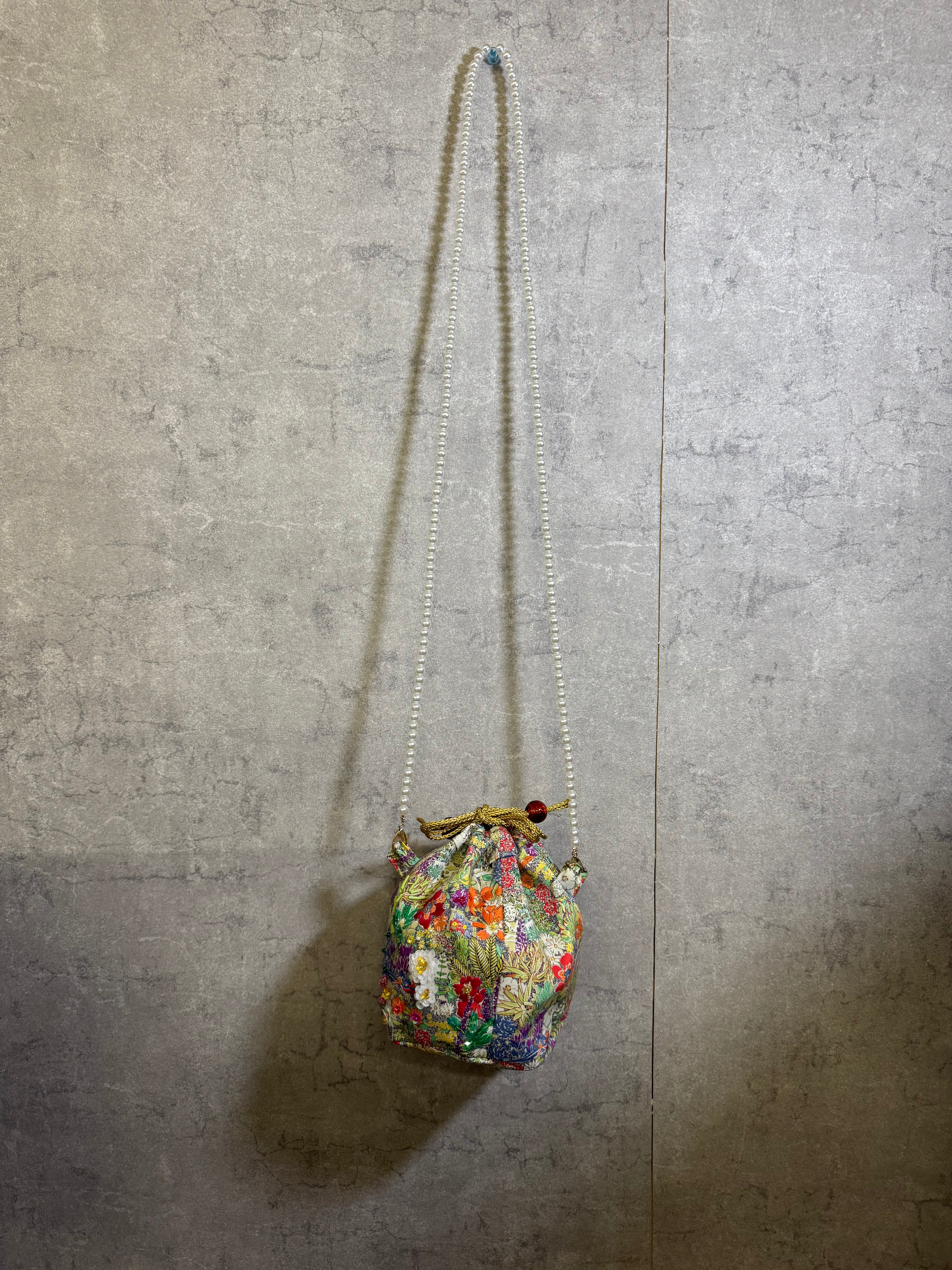 花柄プリト生地ビーズ刺繍巾着バック